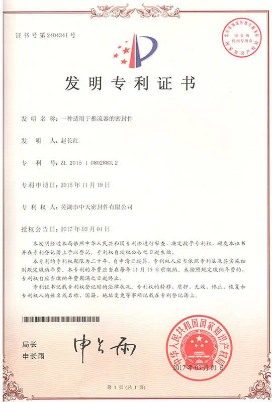 一種適用于推流器的密封件專利證書